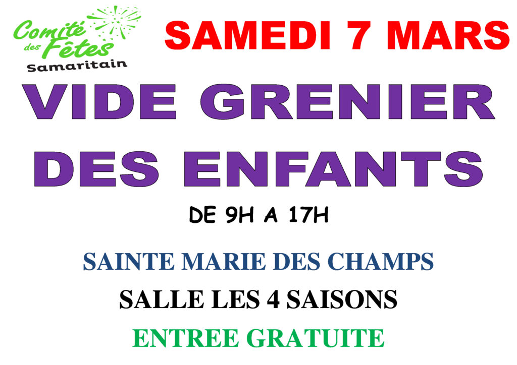 Le Comité des Fêtes Samaritain organise un vide grenier des enfants à la salle des Quatre Saisons, Avenue de l’Industrie le Samedi 7 mars de 9 h à 17 h.
