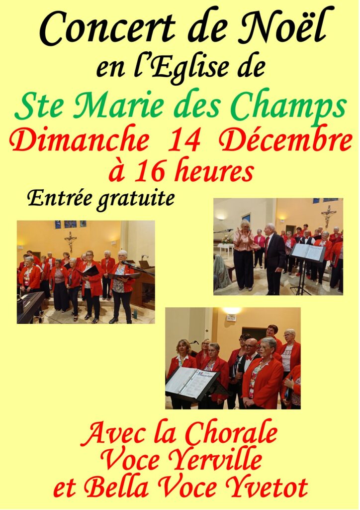 Les chorales Vocce Yerville et Bella Vocce Yvetot se produiront en l’Eglise de Sainte Marie des champs le Dimanche 14 décembre à 16 heures pour un concert de Noël.