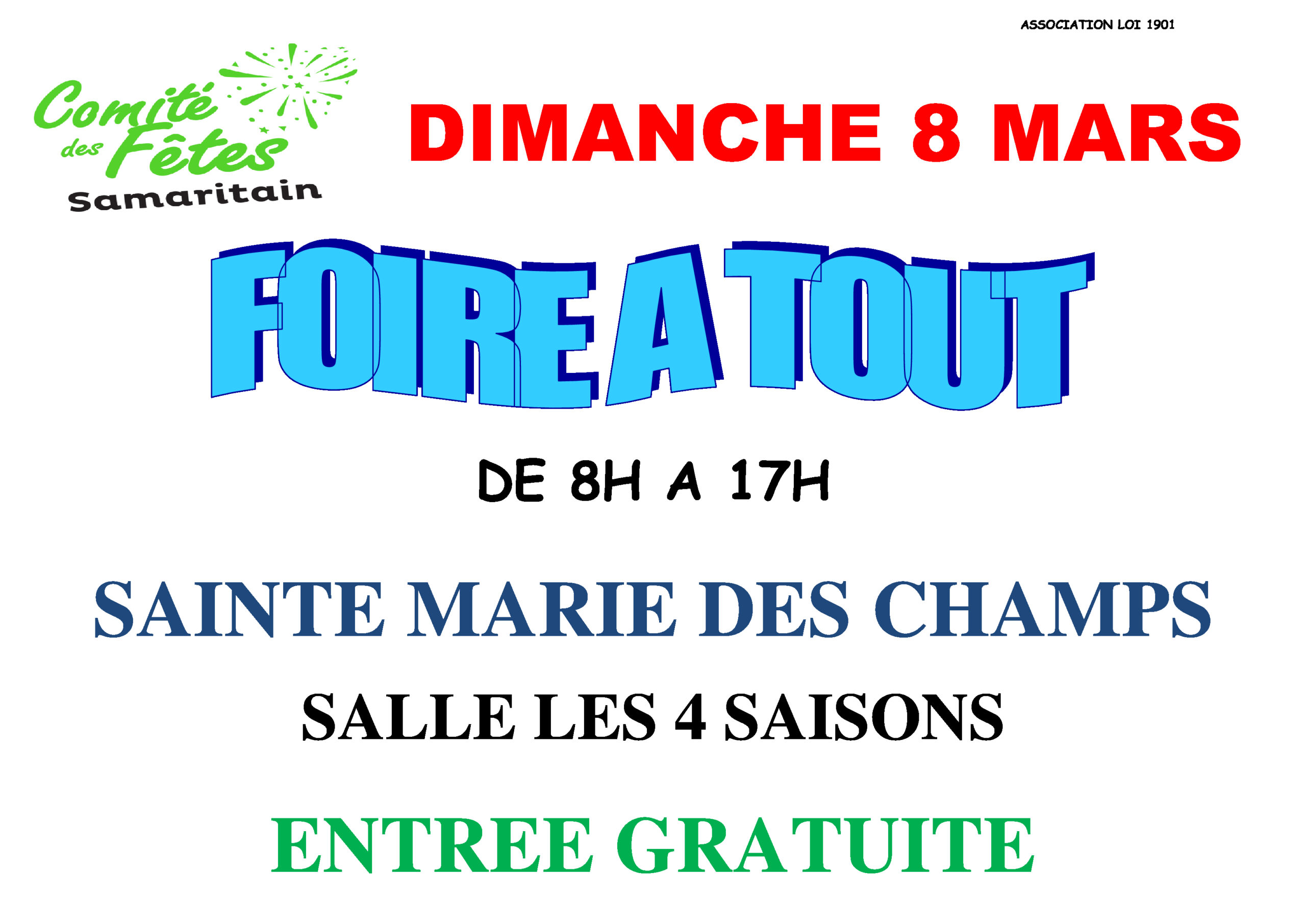 Le Comité des Fêtes Samaritains organise une foire à tout à la salle des Quatre Saisons, Avenue de l’Industrie de 8 h à 17 h