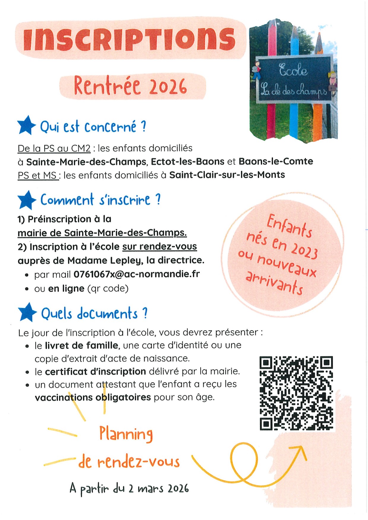 RENTREE 2026, pour les enfants nés en 2023 ou nouveaux arrivants
