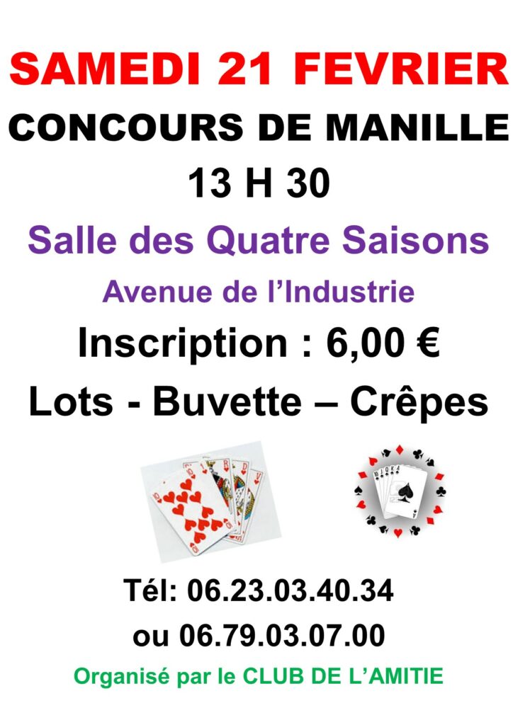 le CLUB DE L’AMITIE organise son concours de Manille le Samedi 21 Février à 13 h 30, à la salle des Quatre Saisons, Avenue de l’Industrie